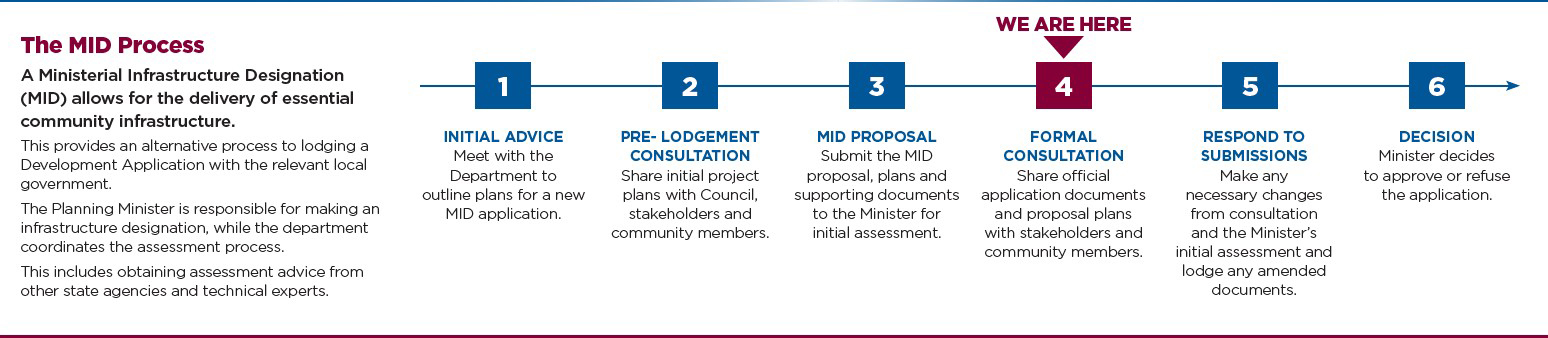 A Ministerial Infrastructure Designation (‘MID’) request has been lodged with the Department of State Development, Infrastructure and Planning (‘DSDIP’). The below outlines the status of this request