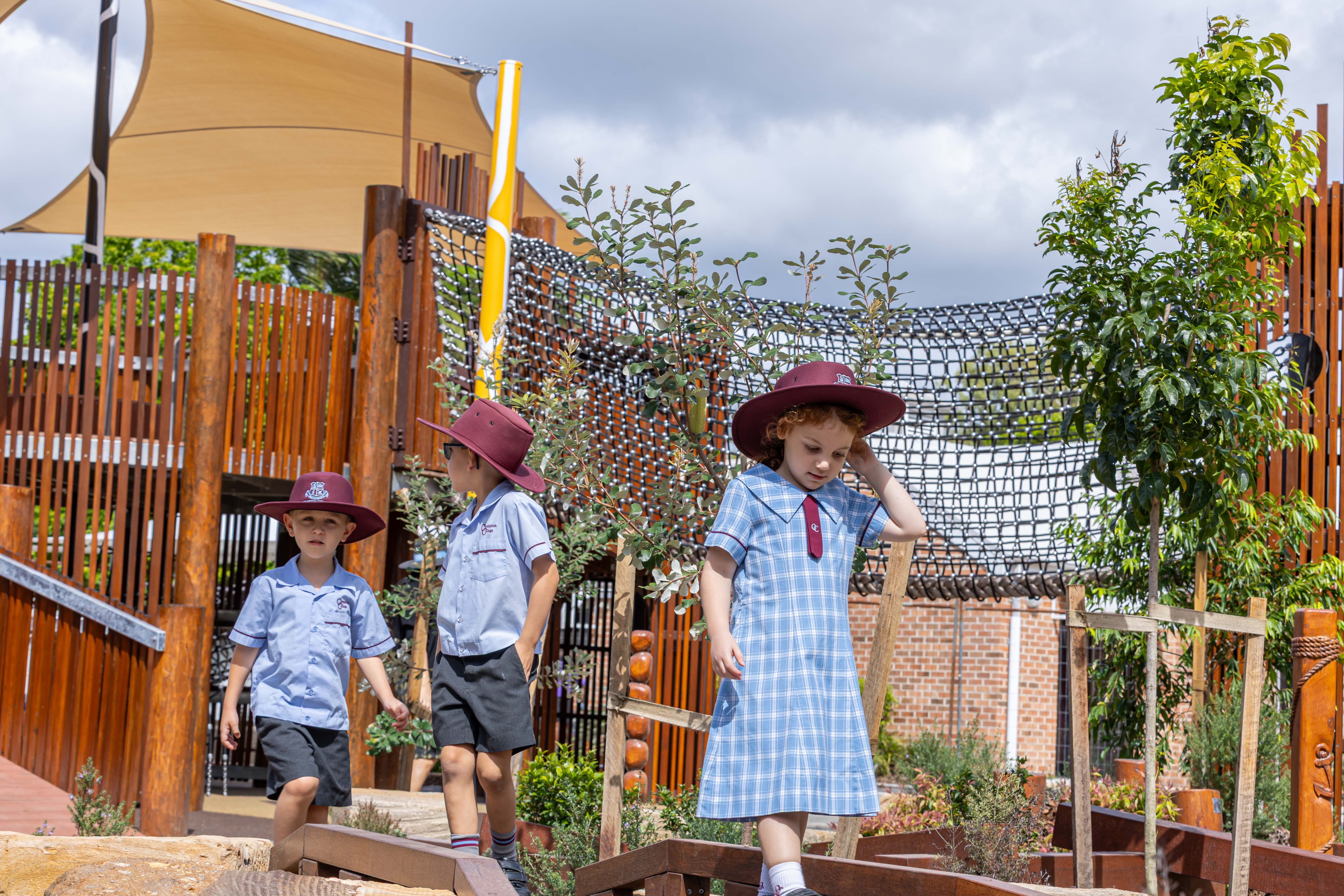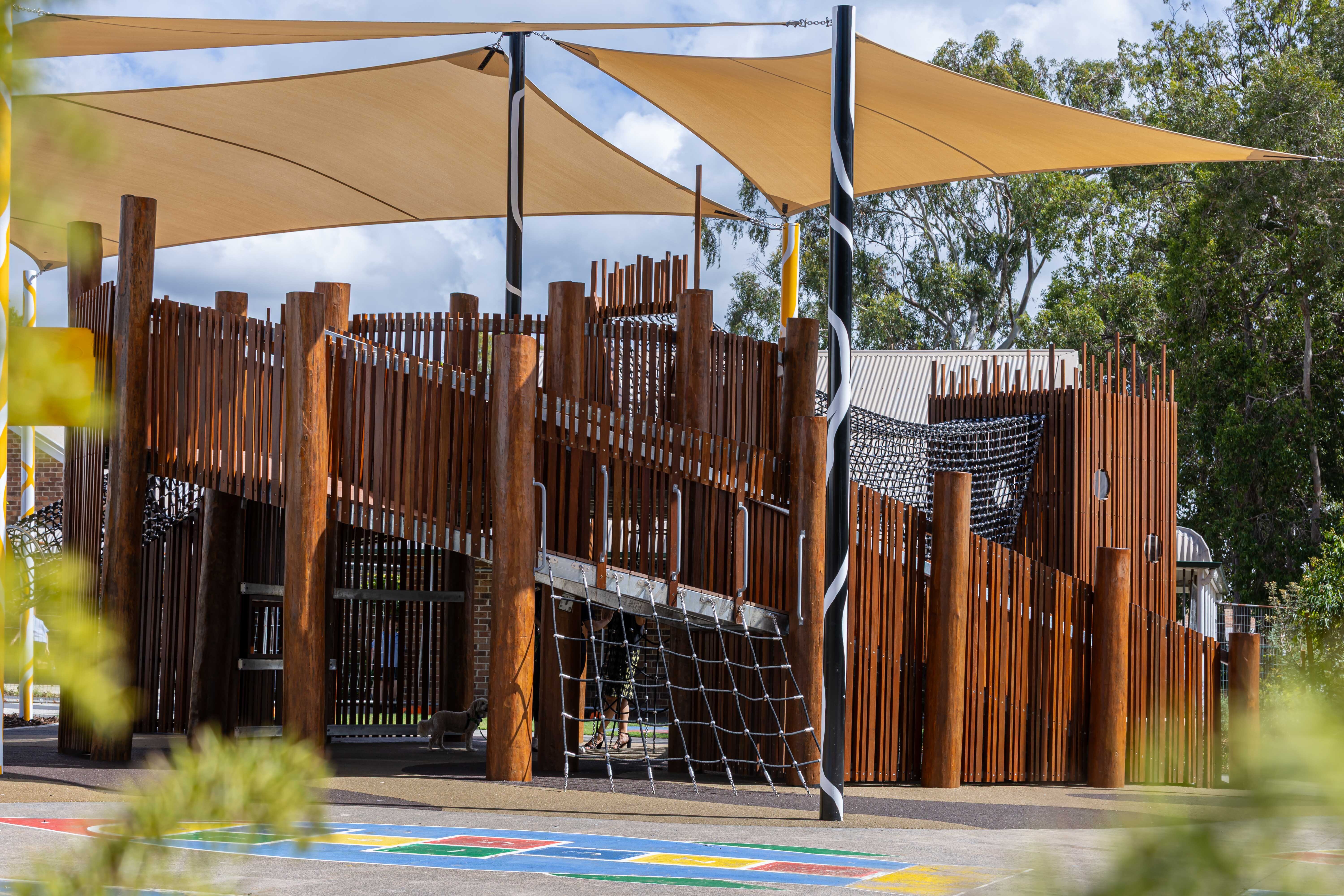 The layout has been thoughtfully planned and features age-appropriate equipment and creative play areas that promote physical development, build confidence and encourage social interaction. A large fort takes centre stage, complete with slides and climbing areas and is set next to a beautiful water play space featuring a creek, balancing planks and timber bridges. The playground also includes a variety of areas for students to explore and discover, from tee pee yarning circles to a maze. An outdoor stage adds another layer of fun and sets the scene for creative play.